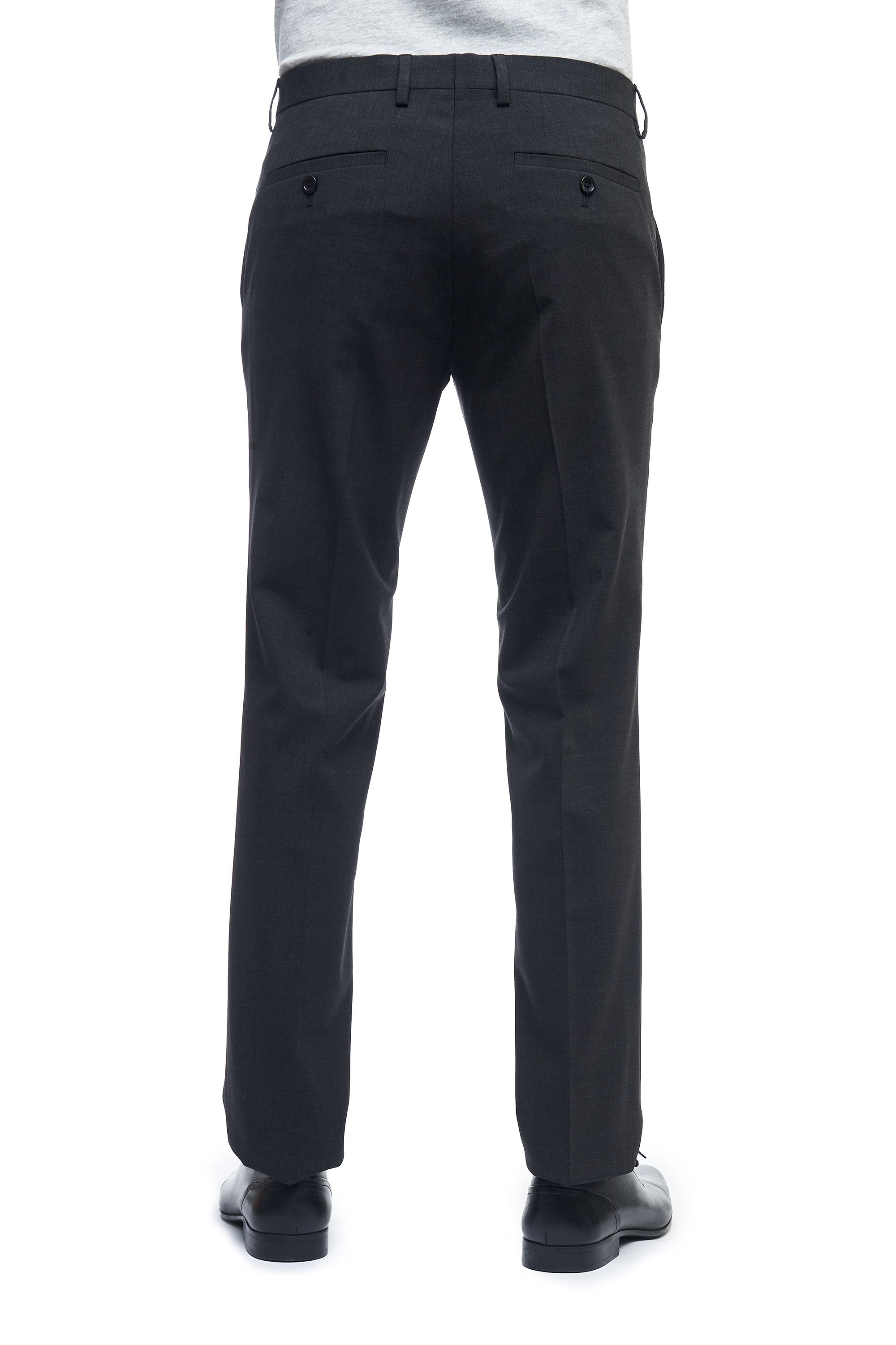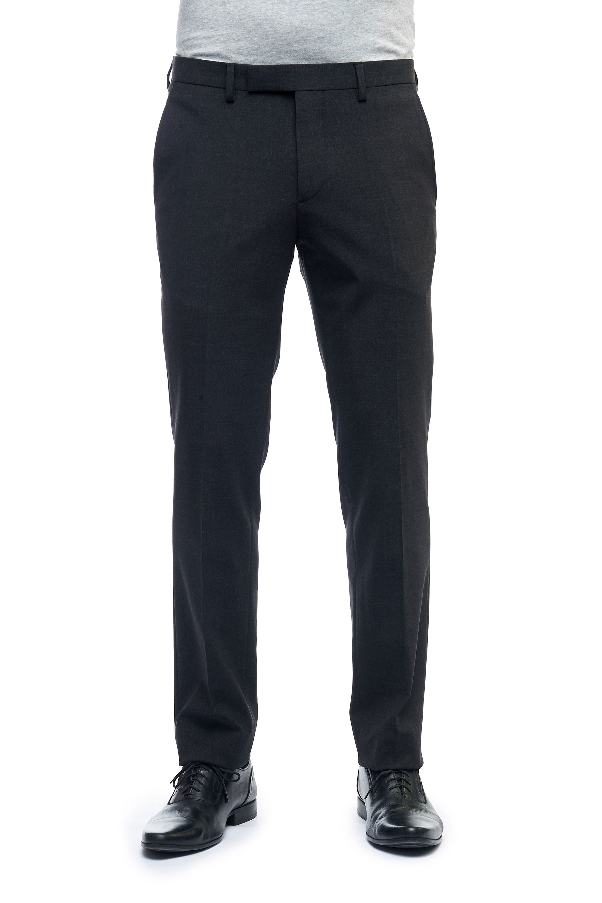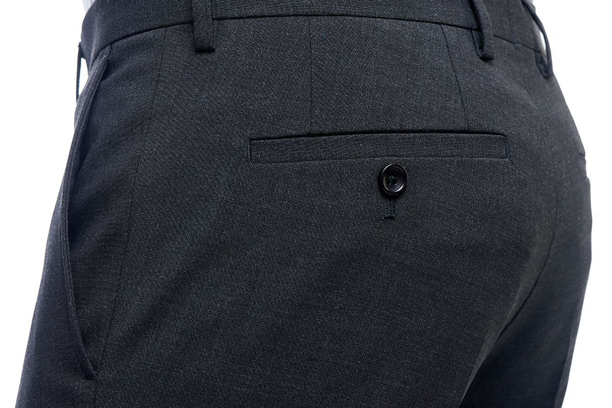 Модель полуприлегающего силуэта со средней высотой посадки. Особенности модели: боковые скошенные карманы, два прорезных кармана сзади на пуговицах, шлевки под ремень, гульфик на молнии.