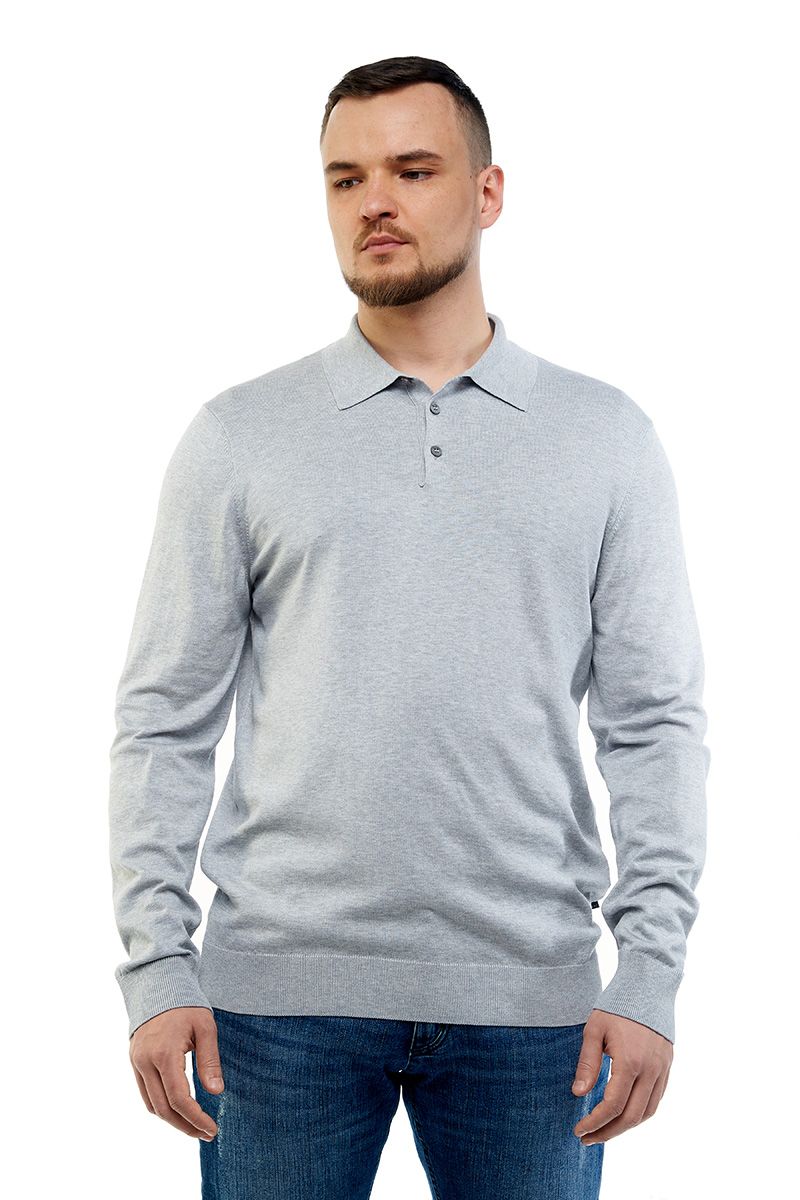 Воротник поло на трех пуговицах, низ изделия и манжеты в рубчик.