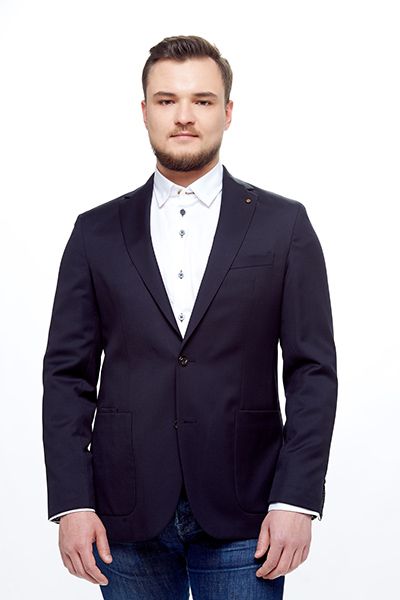 Особенности модели: отложной ворот с лацканами, накладные карманы по бокам, карман - листочка, сзади две шлицы. Застежка на две пуговицы. Отделка внутренних карманов дополнена принтованной тканью. Полный подклад.